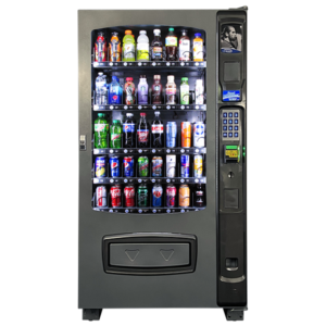 A vending machine designed specifically to dispense bottled and canned drinks.